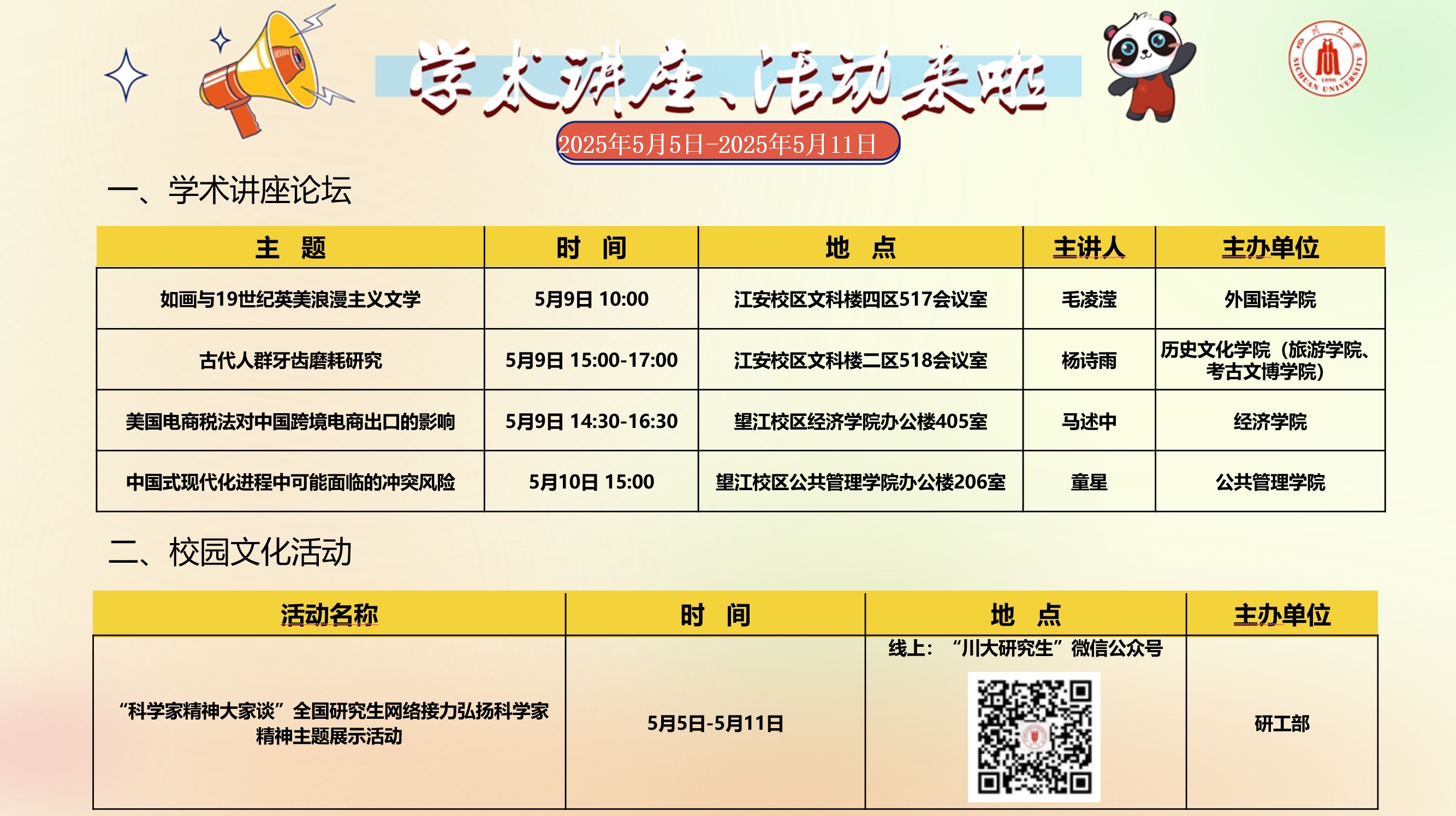 2138CC太阳集团2025年5月5日-5月11日学术讲座论坛及校园文化活动预告