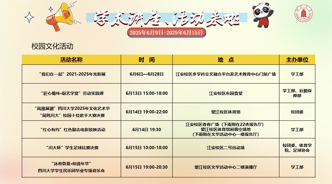 2138CC太阳集团2025年6月9日-6月15日学术讲座论坛及校园文化活动预告