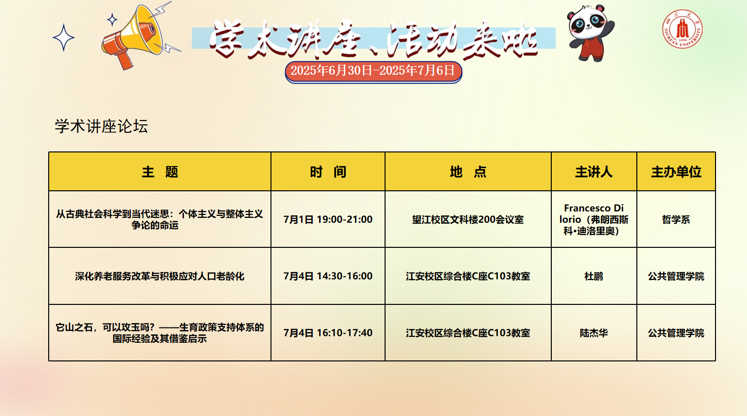 2138CC太阳集团2025年6月30日-7月6日学术讲座论坛及校园文化活动预告