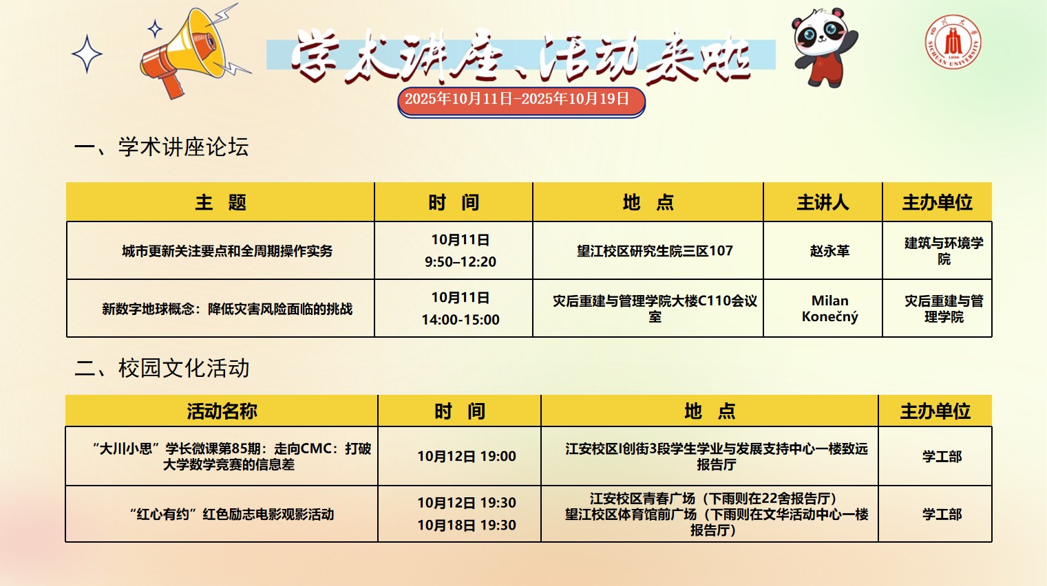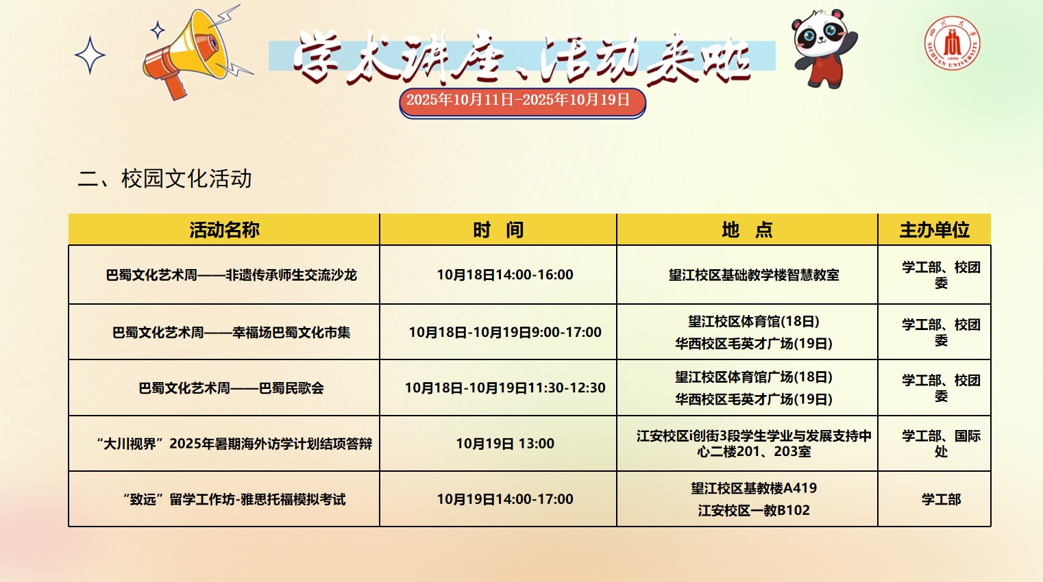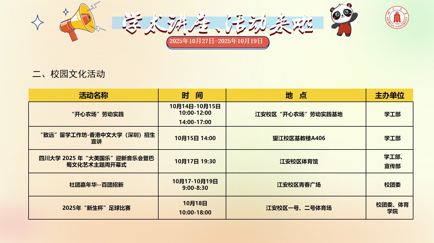 2138CC太阳集团2025年10月11日-2025年10月19日校园文化活动预告