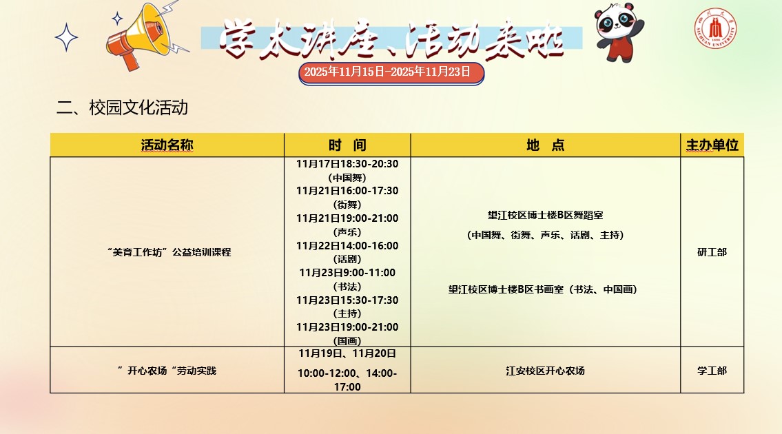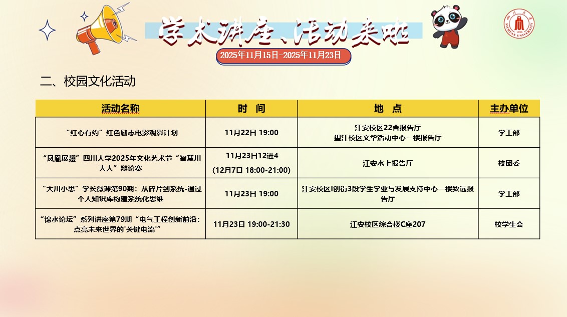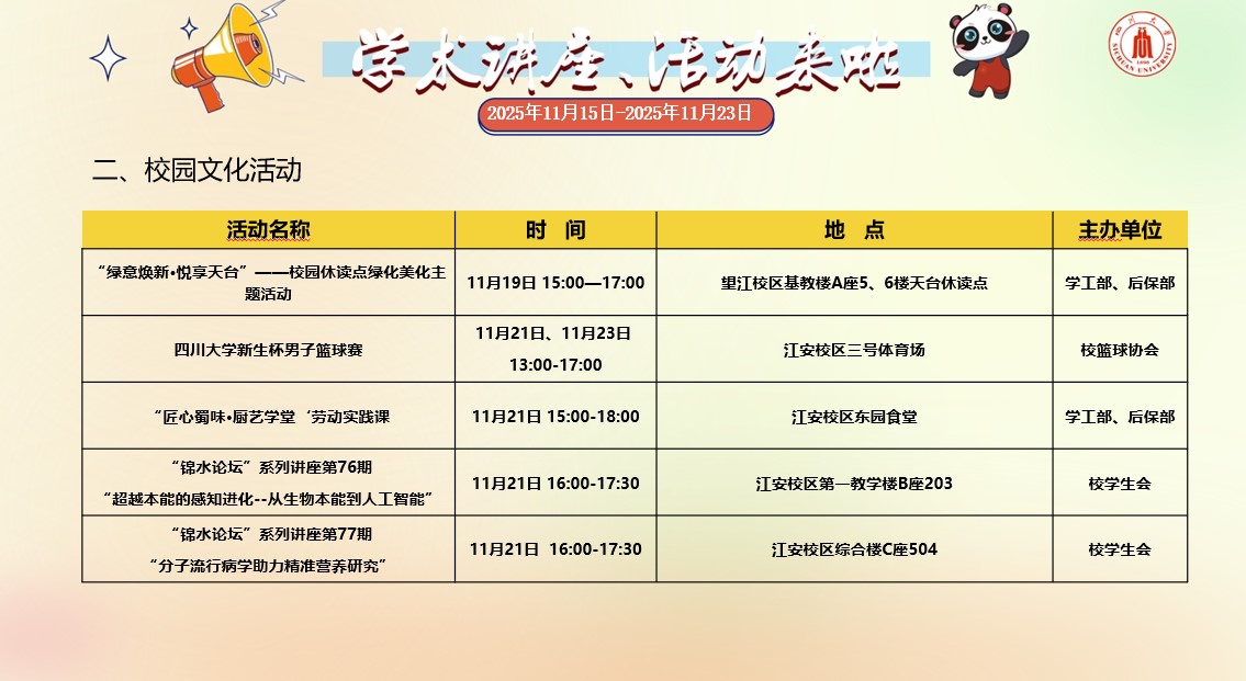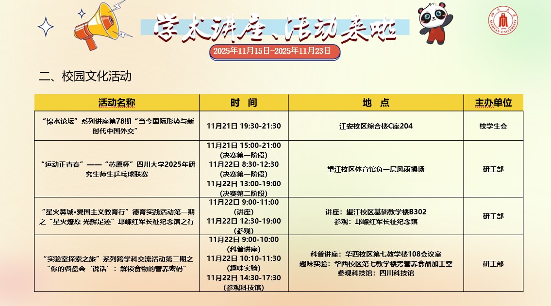 2138CC太阳集团2025年11月15日-2025年11月23日学术讲座和校园文化活动预告