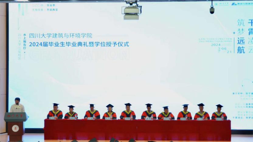 6月21日,学院2024届毕业生毕业典礼暨学位授予仪式在江安校区水上报告厅举行。学院党委书记华国春,院长戴峰,学术院长、教授委员会主任熊峰,副院长兰中仁、刘敏,工会主席楚英豪,土木工程系系主任戴靠山,建筑系系主任赵炜,环境科学与工程系主任赖波,力学科学与工程系系主任刘永杰,毕业班辅导员高倩、赵梓丞、王婷婷、刘凡、蒋卓婷、杨鸿出席典礼。典礼由学院党委副书记兼纪委书记孙伯雷主持。