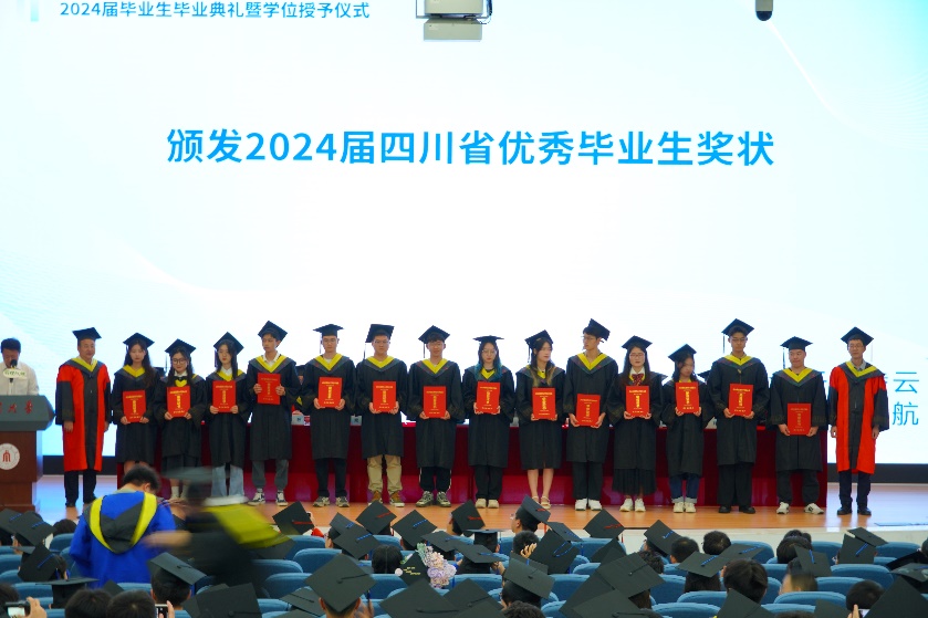 学院院长戴峰宣读四川省教育厅关于表彰2024届四川省优秀大学毕业生的文件和学院设立学院2024届校友联络人的决定。华国春、戴峰共同为学院获奖同学颁奖,出席典礼的领导、老师为2024届校友联络人颁发聘书。