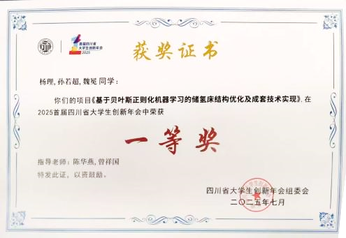 7月6日,由四川省教育厅主办,以“创享无限·实践有为”为主题的2025四川省首届大学生创新年会在成都举行。学院学子表现优异,由力学科学与工程系陈华燕老师/曾祥国教授指导、工程力学专业“强基计划”学生杨理负责的项目《基于贝叶斯正则化机器学习的储氢床结构优化及成套技术实现》,由环境科学与工程系杜烨副教授指导,环境工程专业学生王俊杰负责的《微波释电无极紫外线/臭氧联用工艺对再生水的消毒效果及机制研究》分别斩获一等奖(全校共8项)。