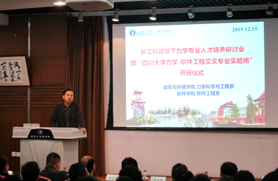 建环学院党委书记、力学教指委委员蒋文涛主持了开班仪式。教务处副处长刘黎、软件学院副院长洪玫先后致辞。刘黎介绍了川大近年来着重推行的“跨学科专业-贯通式”人才培养专项项目,对实验班在立项后短短一年内完成实体筹建及招生工作表示由衷称赞和祝贺。洪玫结合国家“智能制造”战略,认为力学作为基础性学科,与软件工程结合是新工科战略实施发展的必然要求,同时表态软件学院作为合作学院将全力配合、支持实验班教学等相关工作的开展。