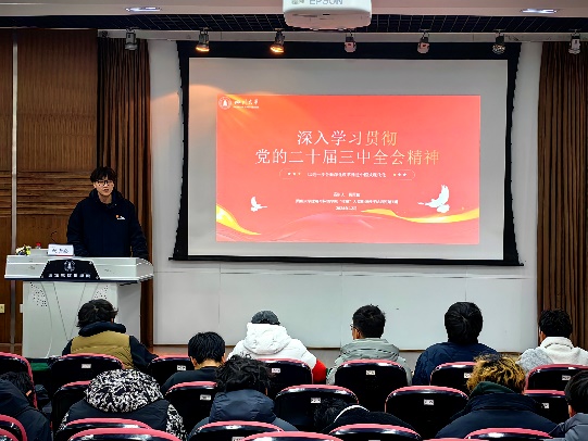 明者因时而变,知者随事而制。学校百川青年学生宣讲团学院分团团长祝青崧作题为“深入学习贯彻党的二十届三中全会精神”的报告。他带领大家一起回顾了历次全会召开的主要内容,指出二十届三中全会是中国式现代化全面推进强国建设、民族复兴的关键时期召开的一次十分重要的会议。苟日新,日日新,又日新,他详细解读了新时代全面深化改革的重大成就与理论创新,帮助同学们更好地理解全面深化改革的重要性和必要性。祝青崧细致阐发了实现中国式现代化目标在14个方面的总体部署,他结合自己读原著学原文的心得体会,号召大家争做新时代改革的勇士。