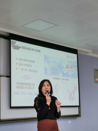 课上,熊峰从“土木工程与人类文明”、“面向未来的土木工程”、“宽口径大土木专业内涵”、“大土木专业课程体系”四个方面展开讲解。她从人类文明历史发展的视角切入,指出土木工程是关乎人类文明、国计民生与生活品质的永恒学科,是推动经济发展、社会进步与技术创新的支柱产业,是推进城市化进程、节能减排与可持续发展的开路先锋,是护卫防灾减灾、韧性建设与工程安全的重要保障。进一步,熊峰又从国家战略的高度强调土木工程“与祖国同命运,与时代同发展”的未来发展趋势,指出在建筑工业化、建筑信息化、绿色建筑、韧性城市等现代化城市建设概念兴起之际,土木工程就扮演着领头羊与奠基者的重要角色。她分别从学校、学院、学生三个方面出发,指出在新时代新环境下国家对本科教育教学改革提出了新要求,要集中力量办人民满意的教育,专业整合已成为必然趋势,并向同学们介绍了学院学科与专业整合的详细情况及宽口径大土木专业的具体内涵。