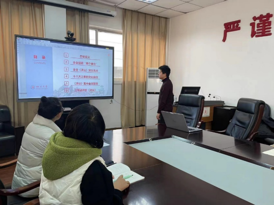党的十九届六中全会在建党百年之际,全面总结党的百年奋斗重大成就和历史经验,体现了我们党重视和善于运用历史规律的高度政治自觉,体现了我们党牢记初心使命、继往开来的自信和担当。为深入学习贯彻党的十九届六中全会精神,12月3日下午,学院2021级本科支部在江安校区学院三楼会议室通过线上线下结合方式开展了以“不愧使命担当,不负伟大梦想”为主题的十九届六中全会精神专题学习,支部书记梅兰菊主持。