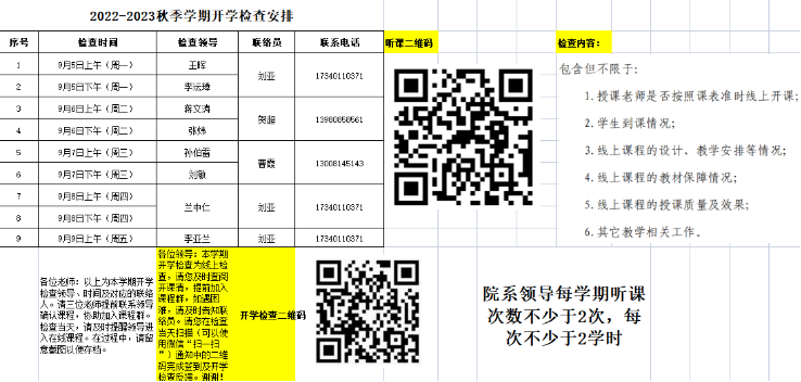本次开学检查,院领导着重检查了每个专业的第一次开课课程、青年教师授课课程及上学期学校督导和学院督导打分偏低的教师课程,共计检查课程100余门次。