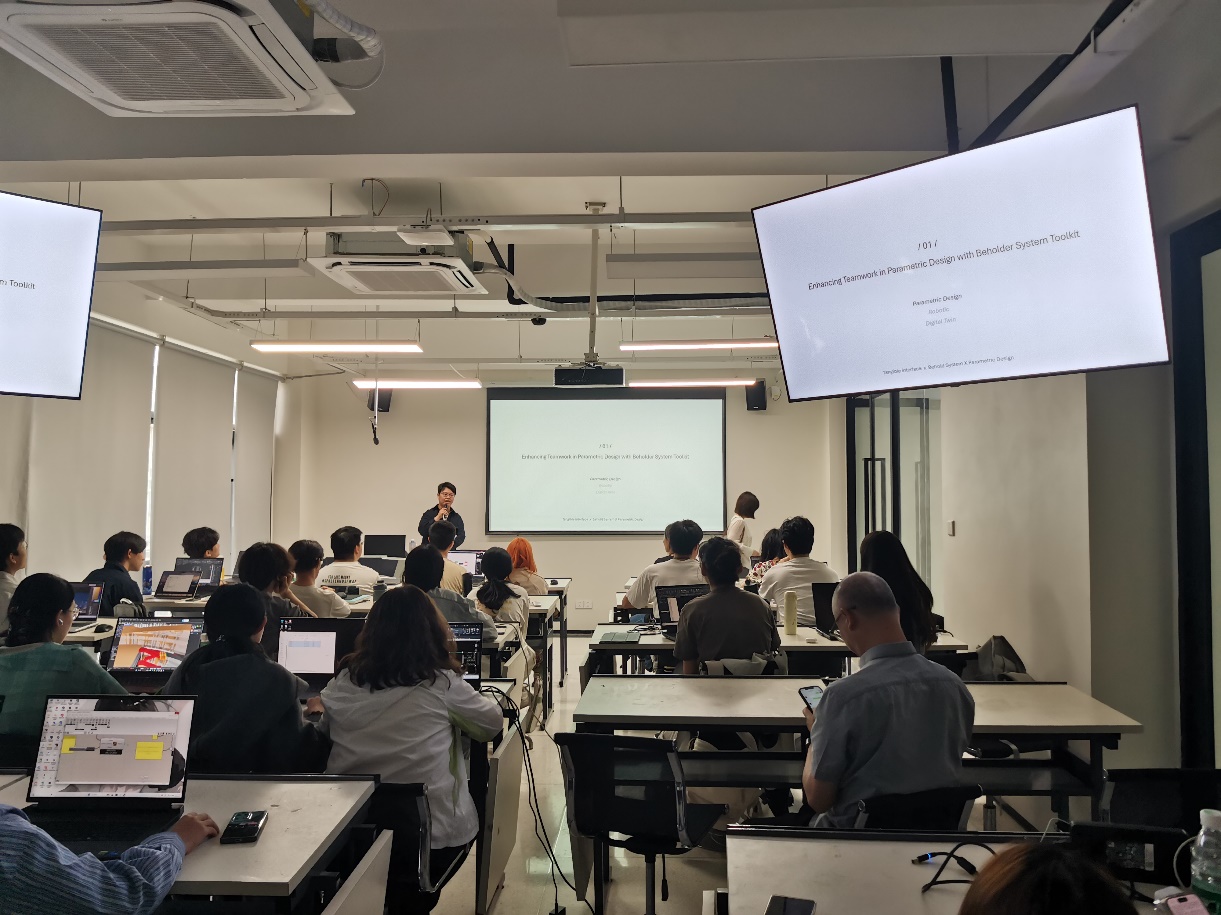 建筑系以“数字技术赋能建筑教育”为核心,开展《参数化设计-2》公开教学活动。丑国珍老师主讲的《参数化设计》系列专业理论课程,紧密跟踪当下数字技术发展趋势,将新近的计算机空间建模技术与环境模拟技术融入建筑设计教学过程,打破了传统建筑设计教学的思维边界,有效拓展了建筑学专业教学的交叉性与创新性,受到选课同学的广泛好评。本次公开教学活动特别邀请了校外该领域研究者王博士及建筑系赵炜、唐浩、冯田、曾如思、方志戎等教师参与观摩。活动中,王博士受邀作了关于空间智能的简要学术报告,从前沿理论角度为课程补充了新视角;课后,参与教师与学生围绕课程内容、教学方法、技术应用等展开热烈讨论,形成了多项建设性意见。此次公开观摩教学不仅为建筑系教师提供了跨视角、多学科的研讨平台,更推动了建筑学专业教学模式的创新探索,助力专业更好、更快地适应行业数字化转型需求。