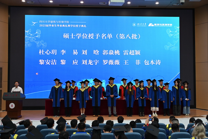 6月24日下午,学院在江安校区水上报告厅举行2025届毕业生毕业典礼暨学位授予仪式。学院党委书记兰中仁,院长戴峰,学术院长熊峰,副院长刘敏、刘永杰,工会主席楚英豪,环境科学与工程系教师代表唐亚,建筑系教师代表罗隽,土木工程系教师代表戴靠山,力学科学与工程系教师代表任利,毕业班辅导员杨胜、翟盼盼、刘芸、李潇,2025届毕业生和家长代表参加典礼。典礼由学院党委副书记兼纪委书记孙伯雷主持。